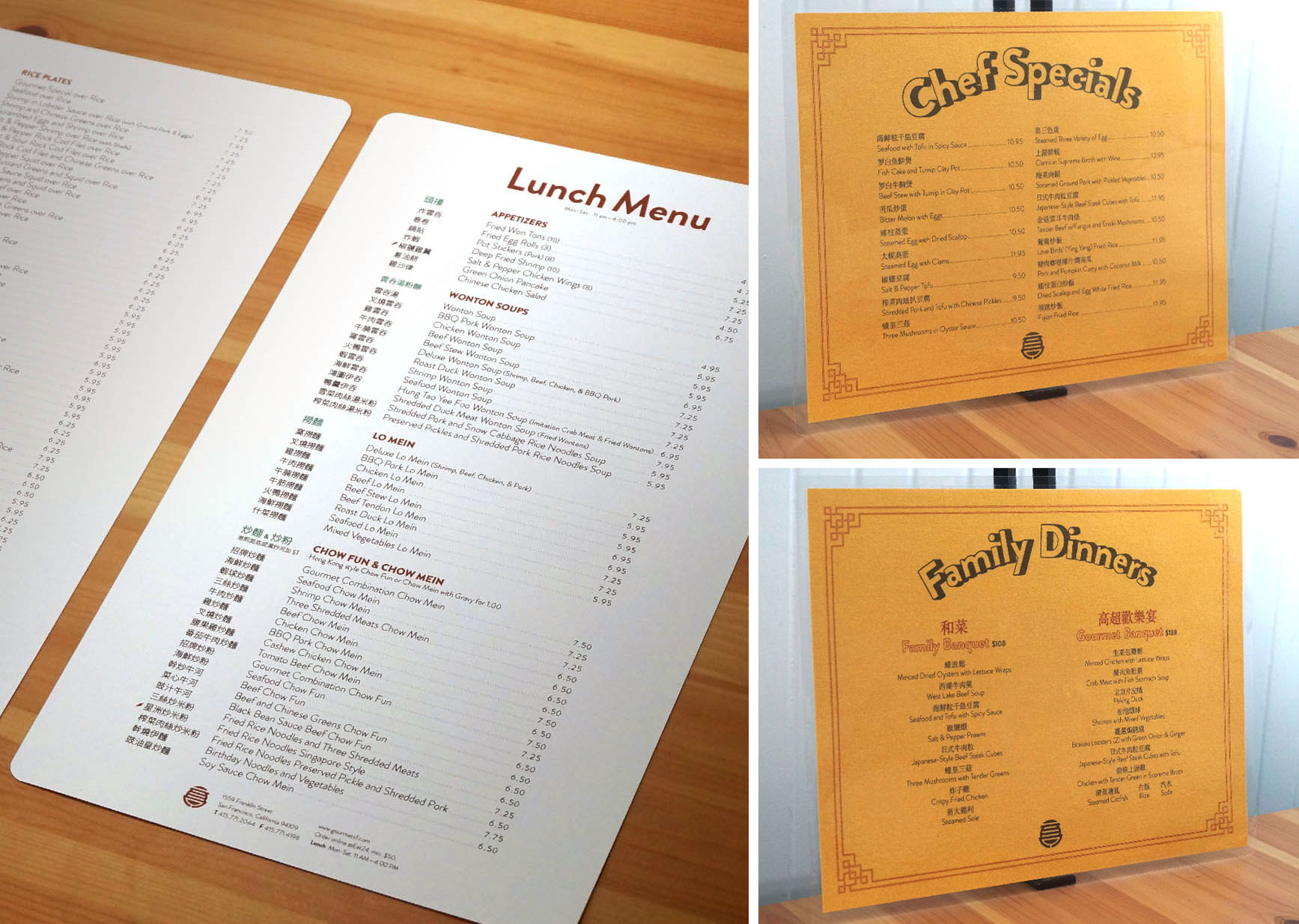 This is a family run Cantonese restaurant in the heart of San Francisco. I'm tasked with updating and refreshing their dine-in menus, takeout menus, business cards, and their website.